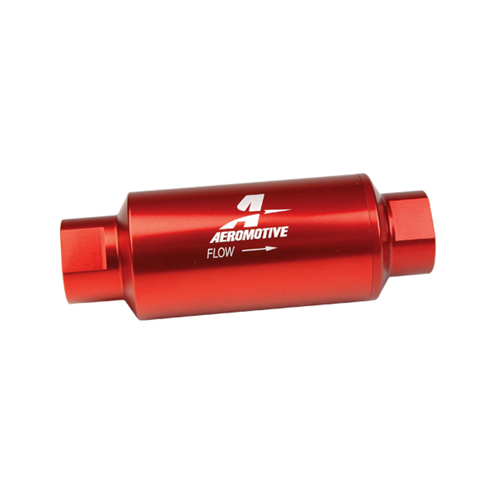 Aeromotive Inline Fuel Filter is a high quality 100 micron filter. It is encased in an aluminum body with anodized red that can support up to 200 psi max. The inlet and outlet ports are -10 AN with o-rings. Featuring a high flow design that have less than a 0.15 psi drop for use with EFI or carbureted engines.