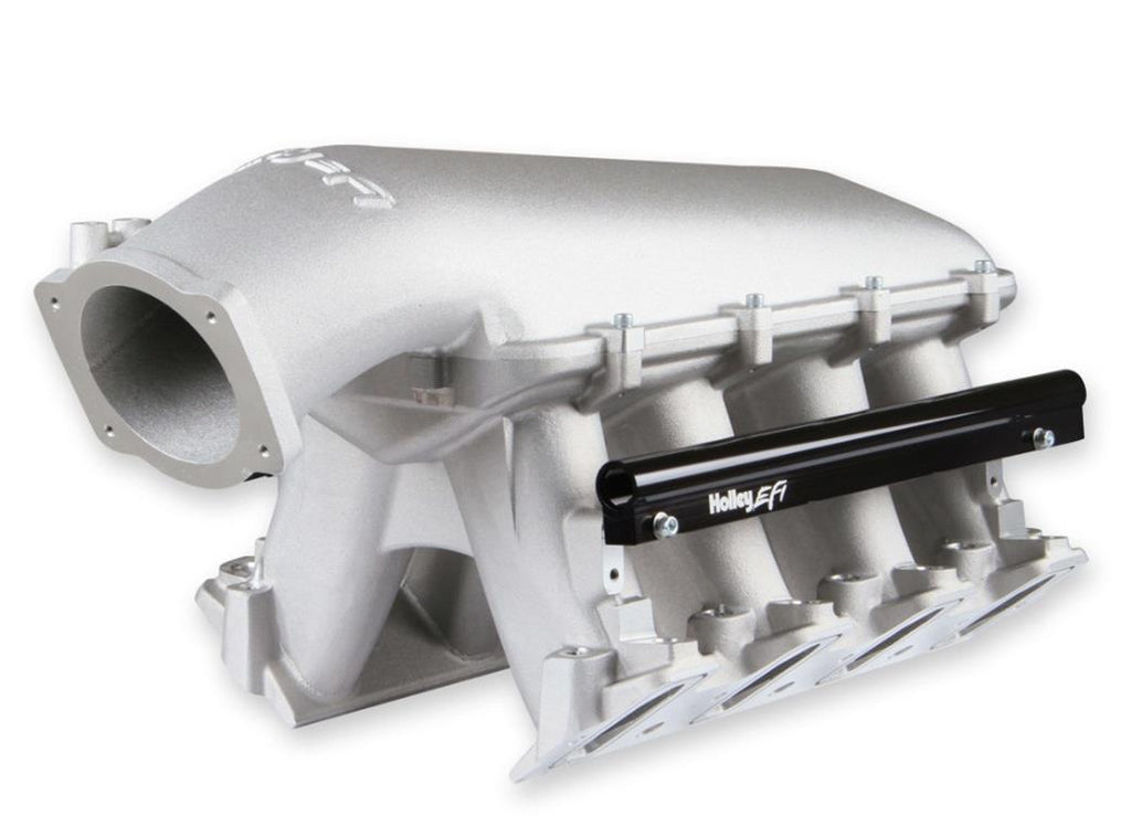 Holley EFI LS Hi-Ram intake manifolds are designed for your high performance race engine. Big cube and high-rev applications without height limitations are the intent for these manifolds. The modular design of these Holley Hi-Ram intake manifolds offers a runner length and as-cast tapered cross-section design that works for a wide range of engine configurations. The included fuel rails are machined for -8 AN O-ring fittings with passages large enough to accommodate high fuel flows and dampen pressure pulsations in the fuel system. Build maximum performance with EFI LS Hi-Ram intake manifolds from Holley.