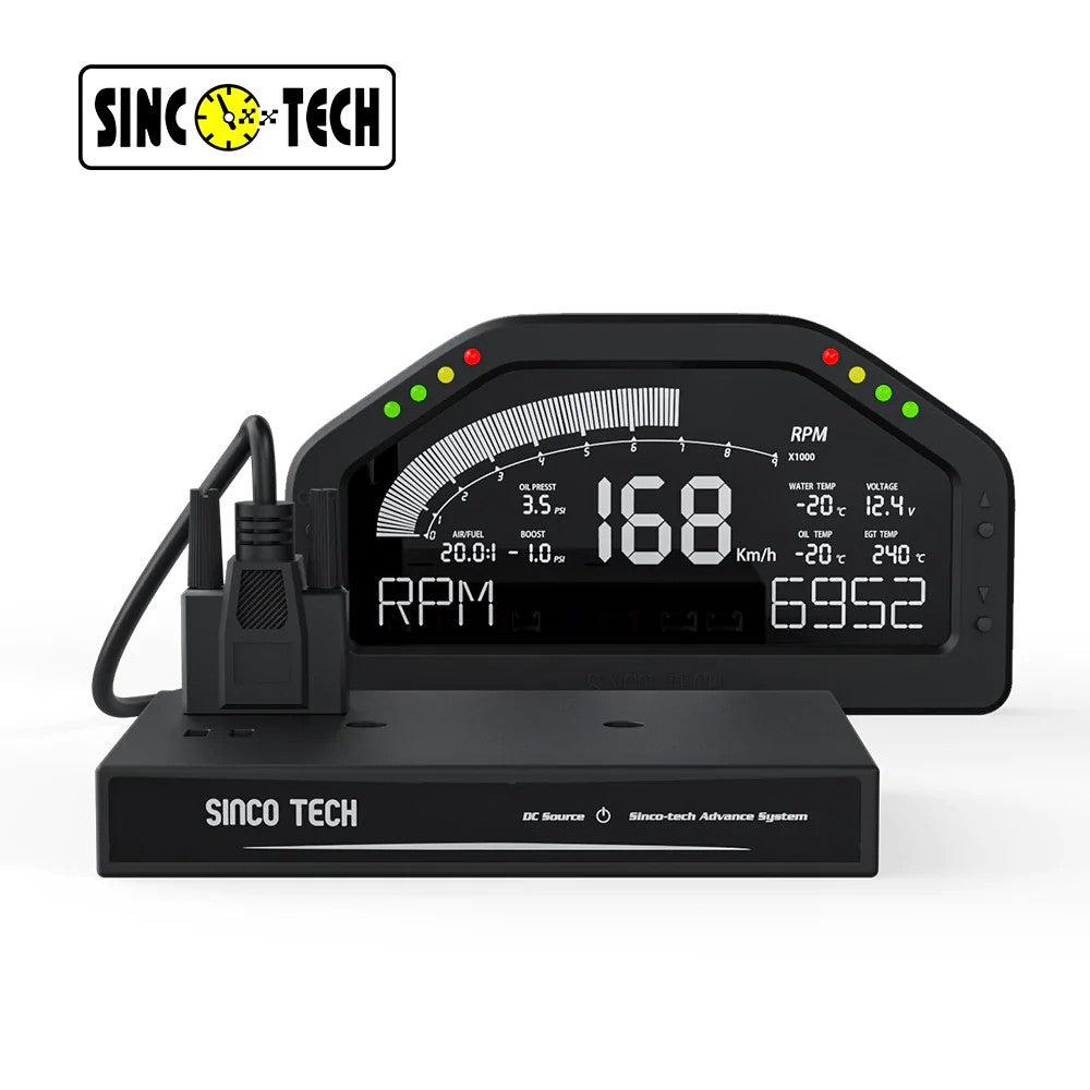 DO926 Multifunctional race dashboard features a 6.5 inch low consumption LCD screen with high precise sensors kit . Chinese/English available, low consumption LCD screen with black backlight with 7 colors display optional, universal to all 12V vehicles( 1-8 engine cylinders), RPM reach to 9000 max. Four speed alarm LED lights and two button keys are designed on either side of display shell.